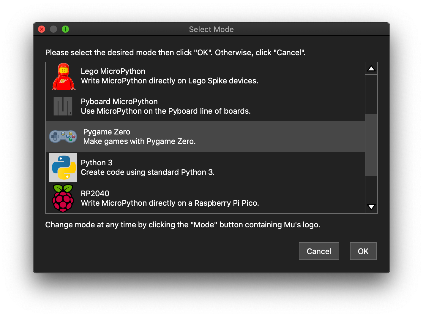 Mu 에디터는 코딩도우미 프로그램으로서 "단순 코드 편집기" 또는 "통합개발환경(IDE) 프로그램" 둘 중에 어느 쪽에 더 가까울까? 답은 때로는 IDE에 좀 더 가깝고, 때로는 코드 편집기에 더 가깝다고 할 수 있다. Mu 에디터에는 본인이 코딩하려는 개발환경(이를 모드(mode)라 지칭)을 선택해 손쉽게 바꿀 수 있는 기능을 제공하고 있는데 한 개의 에디터로 다양한 파이썬 코딩(일반 SW개발코딩, 게임코딩, HW제어코딩 등) 을 손쉽게 할 수 있는 초보자 입장에서는 매우 편리한 기능이다. 이러한 모드를 선택하려면 에디터 상단의 메뉴바(Menu bar)에서 Mode(모드) 아이콘을 누르면 아래와 같은 (개발환경)모드를 선택해 바꿀 수 있으며(이는 마치 tv리모콘으로 tv채널을 변경하듯이 손쉽게), 현재 우리는 파이게임제로를 활용한 게임코딩을 할 예정이므로, 파이게임제로 모드를 선택해 보자.