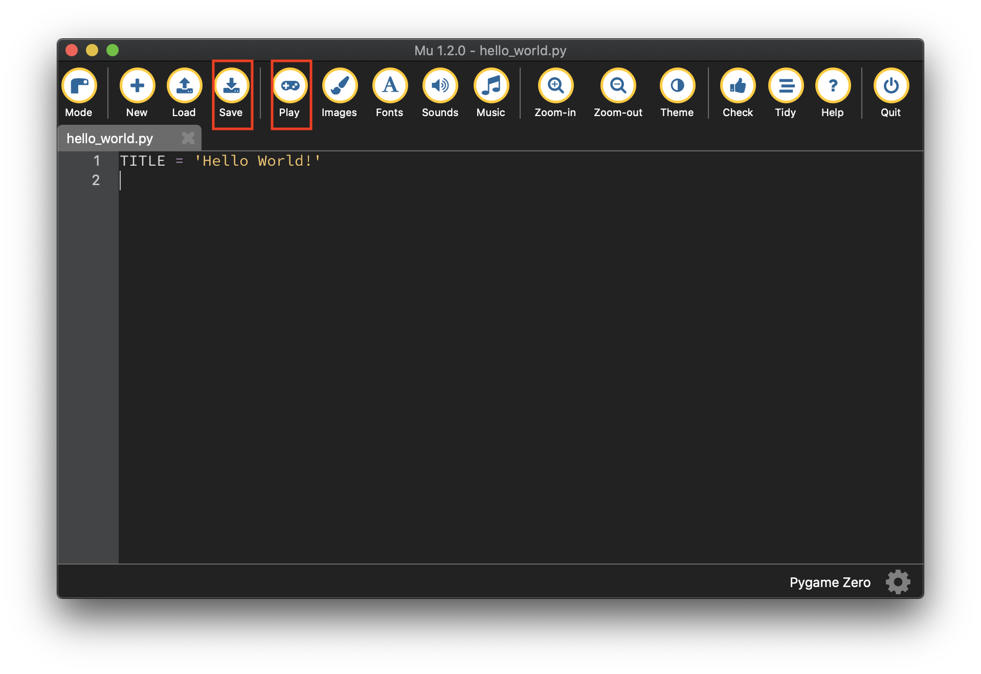 먼저, MU 에디터를 실행시키자. 메뉴바에 있는 New(새 파일) 버튼을 눌러 파일을 열고, 첫 코딩을 시작하자. 다음의 단 한줄짜리 코드를 적어보자.