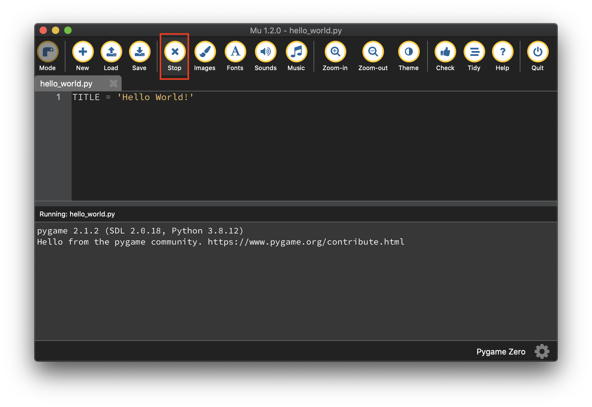 다시 코딩으로 돌아가기 위해 우리는 방금 실행된 앱을 종료시켜야 하는데, 해당 프로그램 창에 x버튼(프로그램 종료버튼)을 눌러 게임앱 자체의 종료는 가능하지만, Mu 에디터에서 다시 코딩을 이어가려면 반드시 메뉴바의 Stop(정지) 버튼을 눌러 종료시켜야 한다는 것을 잊지말도록 하자.
